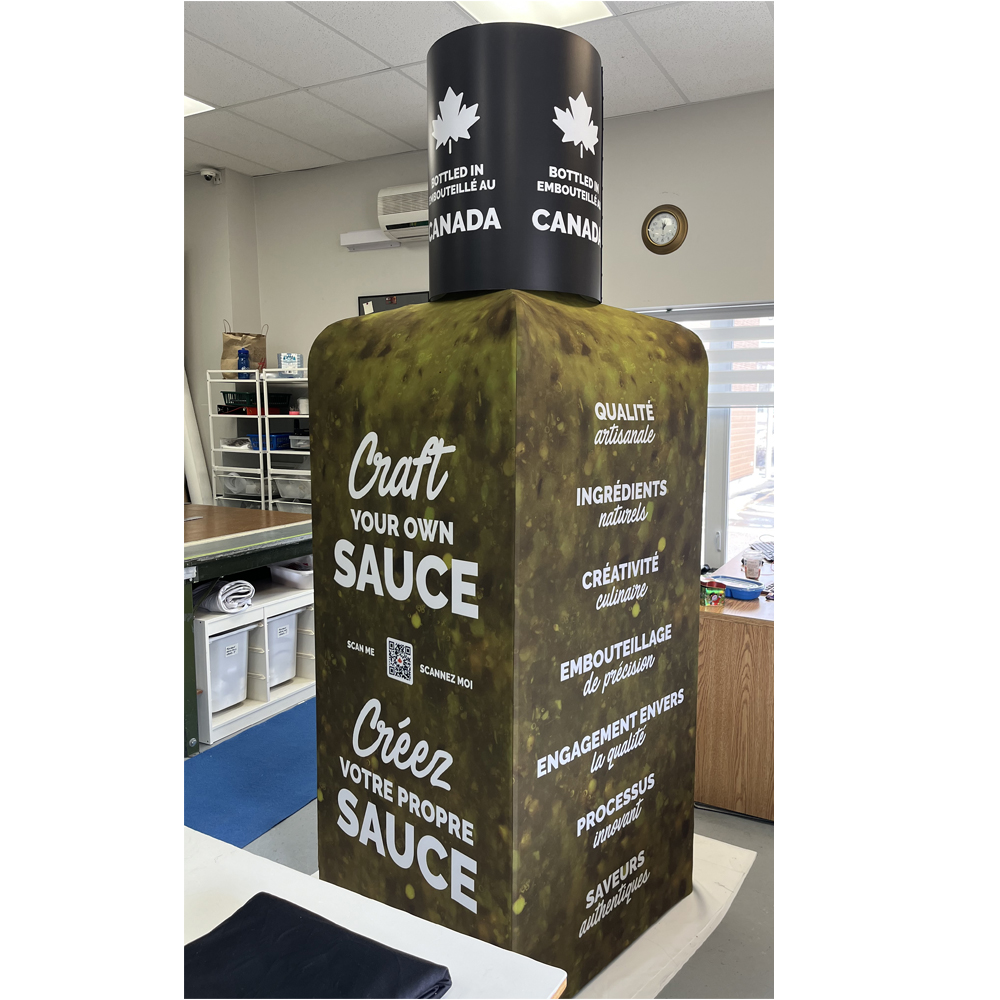 Nous avons des imprimantes grand format permettant d’imprimer sur papier pour ensuite être transféré par sublimation sur le textile. Ce procédé unique permet l’impression sur tissu de façon permanente. L'entreprise fabrique plus de 3000 kiosques annuellement qui sont expédiés à la grandeur du pays.