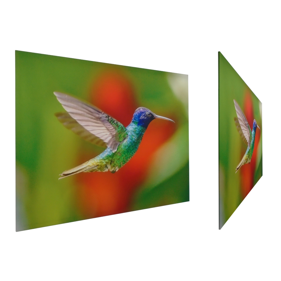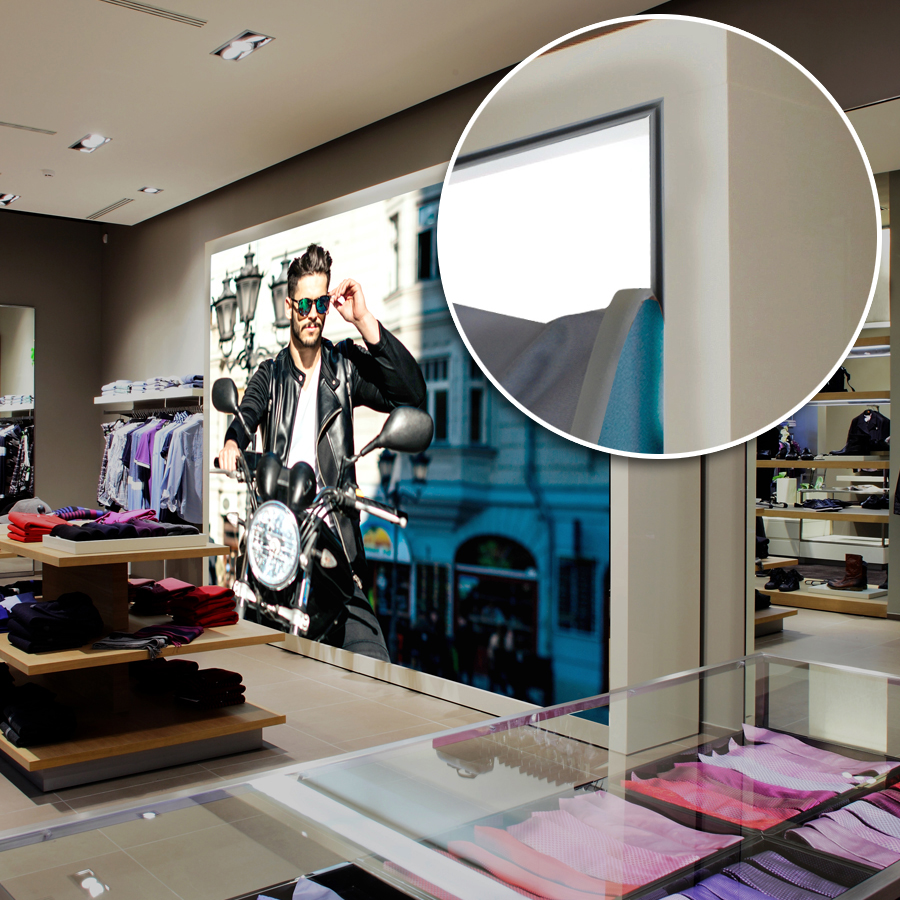 Cadre d’aluminum disparaissant totalement pour laisser place au tissu imprimé avec finition silicone permettant une installation parfaite.