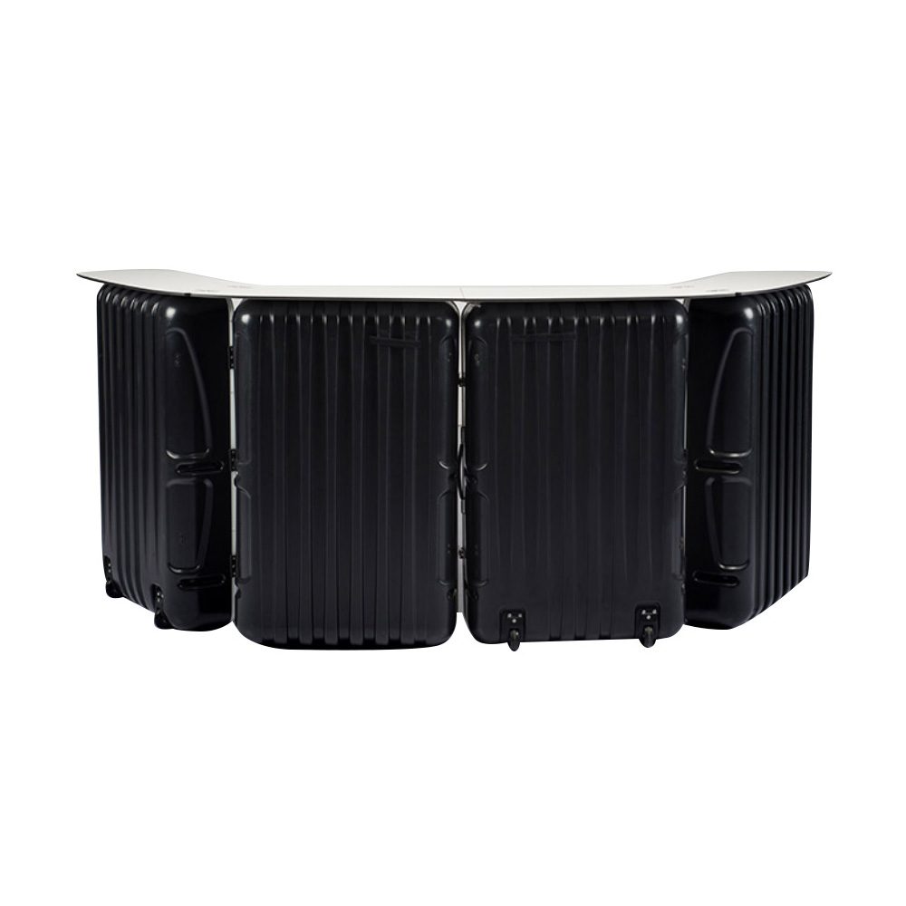 Deux caisses de transport rigides pouvant se convertir en un comptoir double de grand format. Quatre tablettes intérieures incluses.