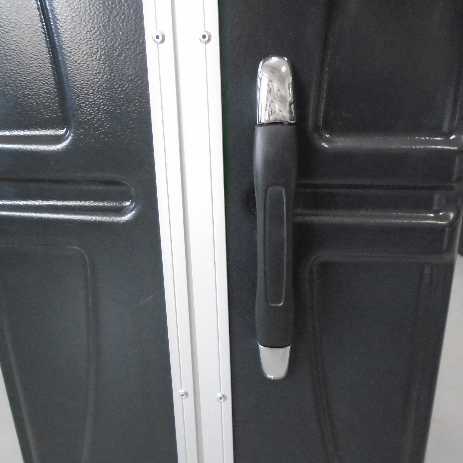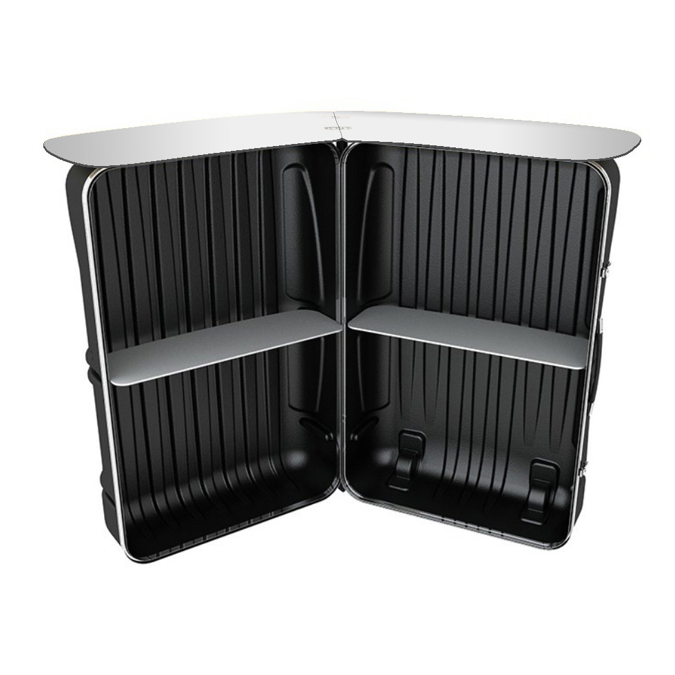 Une caisse de transport rigide pouvant se convertir en comptoir pratique muni de deux tablettes intérieures.