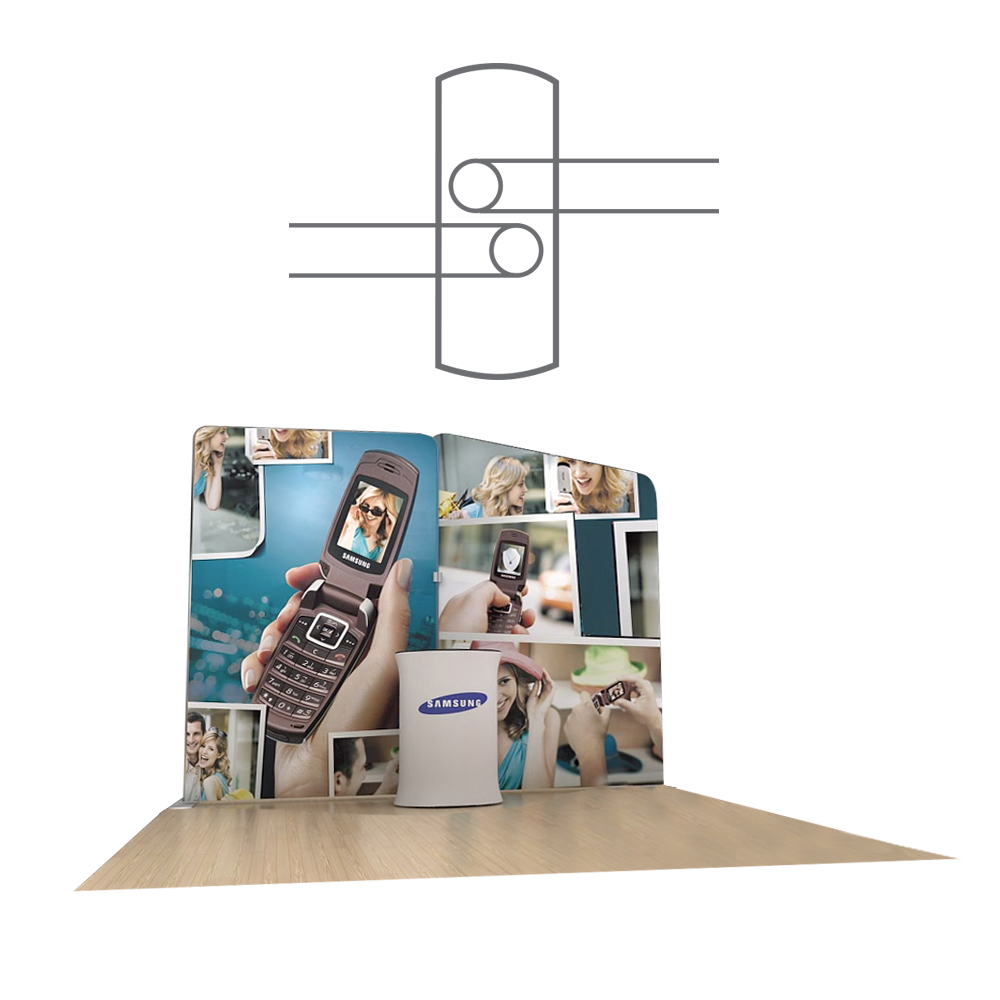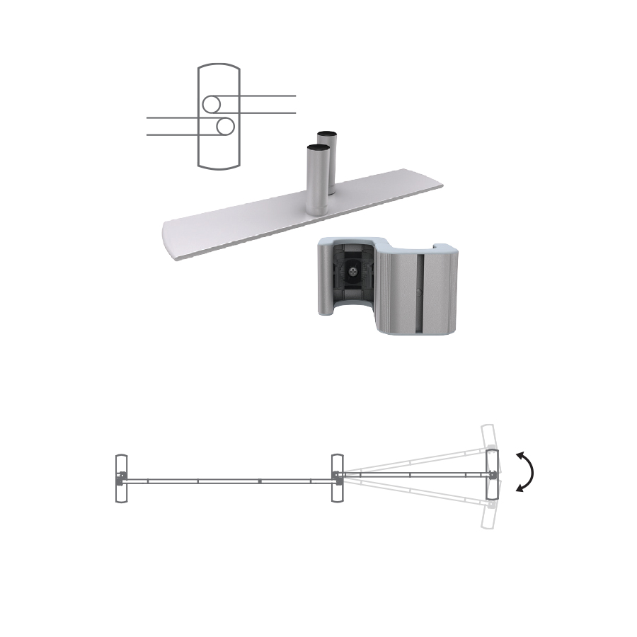 Pied double permettant de relier deux panneaux Horizon Media en se chevauchant. Positionnement panneau de gauche en avant et panneau de droite vers l’arrière.