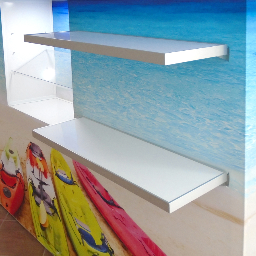 Tablettes blanches pour kiosque Reflexion. Possibilité d’ajouter plusieurs tablettes sur les croisillons de la structure interne.